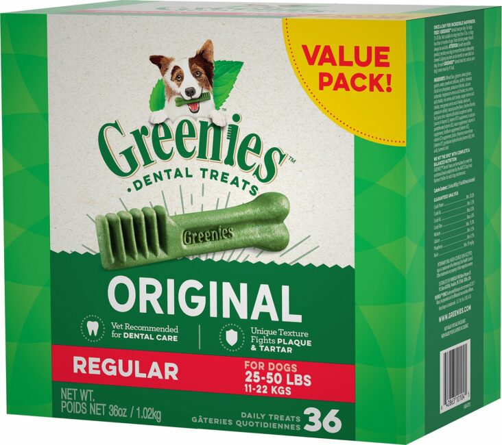 Reward your dog with clean teeth, fresh breath, and loads of vitamins and minerals with every delicious treat. Formulated with an optimal blend of soy and wheat protein for ease in digestion. Toothbrush shape, tapered shaft and contoured knuckle offer a better surface for teeth cleaning. Chewier texture helps reduce plaque, and keeps gums healthy. Scientifically developed in 5 different sizes to ensure a perfect bite based on your dog's skull type. Designed to offer complete and balanced nutrition with 52% protein and low in fat. Your pets will love the new Greenies.