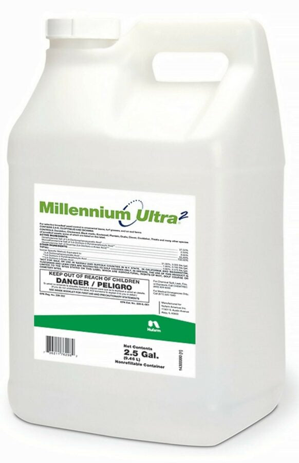 Count on Millennium™ Ultra 2 to deliver ultra weed control. This premium post-emergence herbicide provides extraordinary control of the most challenging broadleaf weeds including clover, speedwell, ground ivy and Virginia buttonweed. Since Millennium Ultra 2 translocates to the roots, even deep-rooted perennials such as thistle, goldenrod, artichoke and nettle are no match for its power. The unique formulation of 2,4-D, clopyralid and dicamba is one of the most effective formulations for broad-spectrum weed control available in the market today. Millennium Ultra 2 is your premium weed control option in athletic/recreational fields, cemeteries, sod farms, golf courses, industrial sites, non-cropland, rights-of-ways and roadsides