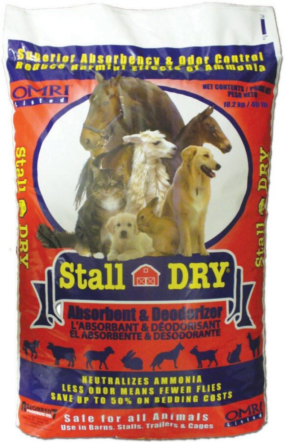 When used daily, Stall Dry can improve your animals' comfort, reduce bedding costs and save labor (clean-up time). It is safe to use on dirt, wood, concrete, metal or rubber surfaces, because it is non-caustic and non-toxic. Neutralizes ammonia on contact with urine and absorbs up to 140% of its weight in liquid. Covers up to 1,000sq. ft
