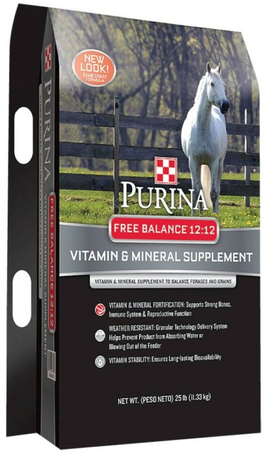 For horses who are not receiving a balanced concentrate feed, the highly palatable Purina® Free Balance® 12:12 Vitamin & Mineral Supplement provides the added vitamins and minerals needed to balance a pasture or hay-only diet.