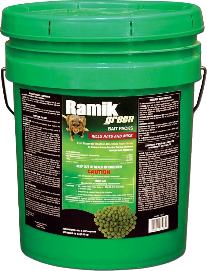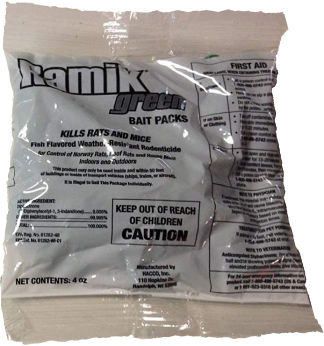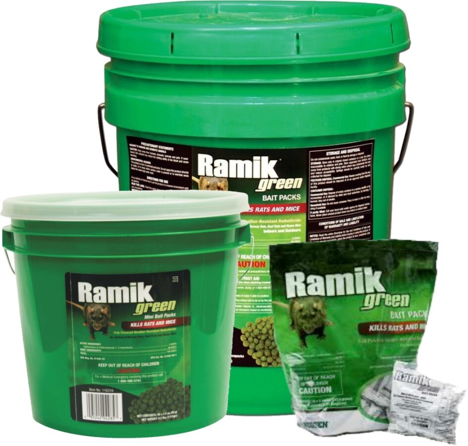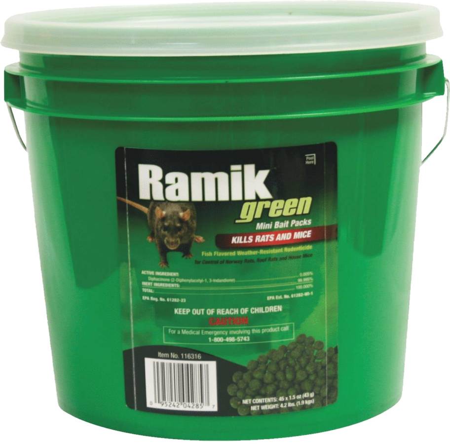 Ramik Green nuggets in convenient, ready-to-use bait packs. No need to touch bait; rodents will gnaw open the packs