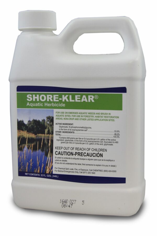 Shore-Klear Liquid with glyphosate is a broad spectrum, root killing, systemic herbicide. Controls floating and emersed weeds in and around surface waters. Great on land too!