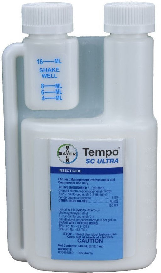 Tempo® SC Ultra insecticide delivers the power of a powder formulation in a liquid. It’s easier to use, less messy to handle, needs less agitation and is more evenly dispersed during application. The formulated product contains 11.8% Beta cyfluthrin and is available in 240-ml. and 900-ml. bottles.